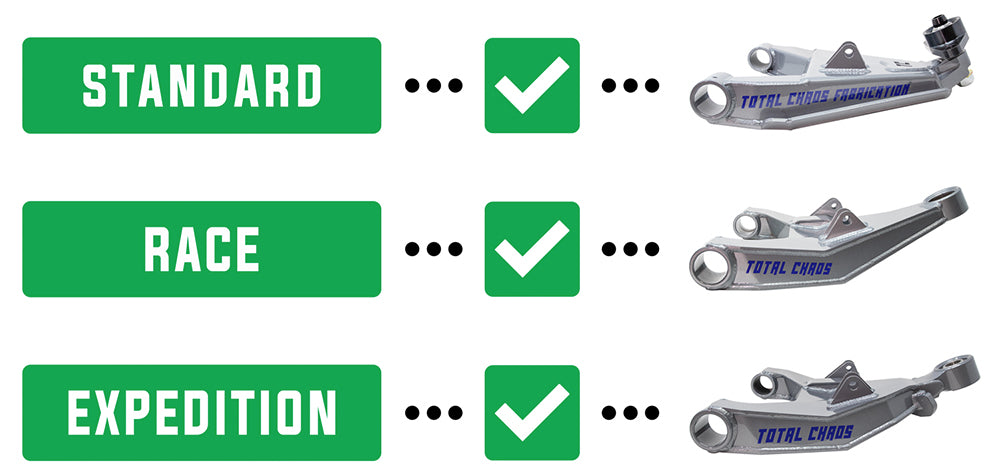 DESIGNED FOR USE WITH TOTAL CHAOS CONTROL ARMS ONLY. WILL NOT FIT FACTORY CONTROL ARMS.